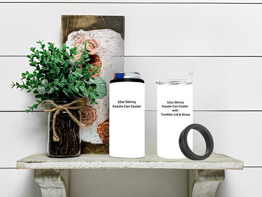 Each skinny can cooler includes a 12oz stainless skinny koozie can cooler and a black screw on top to hold in your drink. Optional screw on clear tumbler lid & straw are also available for purchase.